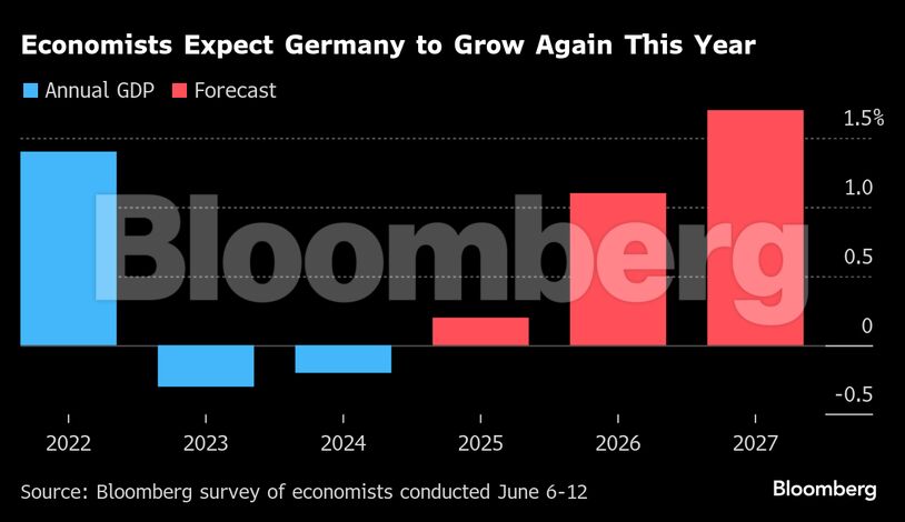Η γερμανική οικονομία αναμένεται να επιστρέψει στην ανάπτυξη το 2025, μετά από δύο χρόνια ύφεσης, σύμφωνα με αναλυτές που συμμετείχαν σε δημοσκόπηση του Bloomberg και εμφανίζονται ελαφρώς πιο αισιόδοξοι για τις βραχυπρόθεσμες προοπτικές της χώρας σε σχέση με άλλους φορείς.
