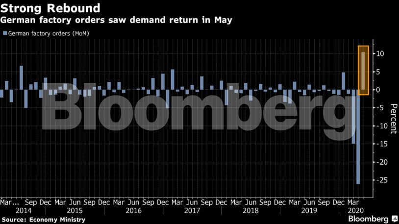 Οι βιομηχανικές παραγγελίες αυξήθηκαν κατά 10,4% τον Μάιο, μετά την πτώση ρεκόρ που είχε σημειωθεί τον Απρίλιο. Οι πωλήσεις προς την ευρωζώνη αυξήθηκαν κατά 43,5%.