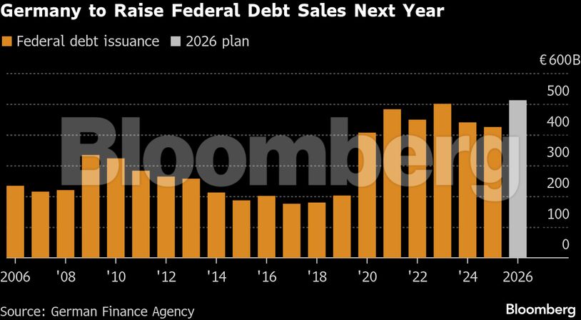 Η Γερμανία θα αυξήσει τις πωλήσεις ομοσπονδιακού χρέους κατά 1/5 το επόμενο έτος, σε επίπεδα ρεκόρ 512 δισεκατομμυρίων ευρώ, προκειμένου να χρηματοδοτήσει μια σειρά δαπανών με στόχο την αποκατάσταση της ερειπωμένης υποδομής της και τον εκσυγχρονισμό των ενόπλων δυνάμεών της.