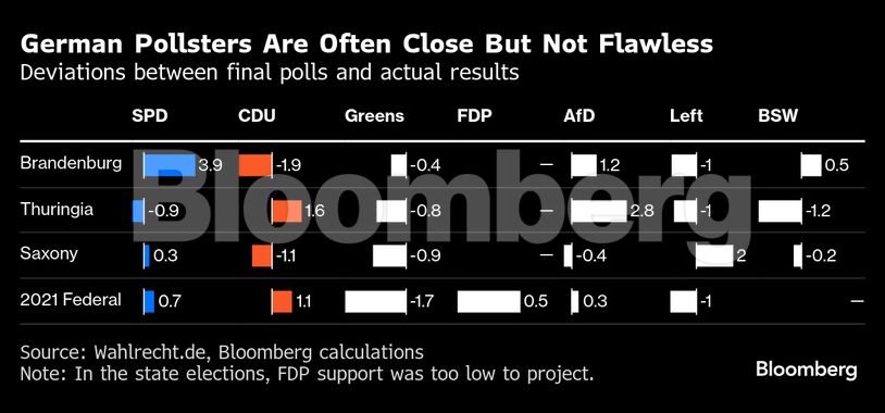 Οι δημοσκοπήσεις για τις εκλογές της Γερμανίας έχουν αποδειχθεί σχετικά ακριβείς στις προηγούμενες εκλογές και ελάχιστα μεταβλήθηκαν κατά τη διάρκεια της τρίμηνης προεκλογικής εκστρατείας που οδήγησε στην ψηφοφορία της Κυριακής. Οι δημοσκόποι εξακολουθούν να είναι νευρικοί, ενώ δεν αποκλείουν το ενδεχόμενο έκπληξης.