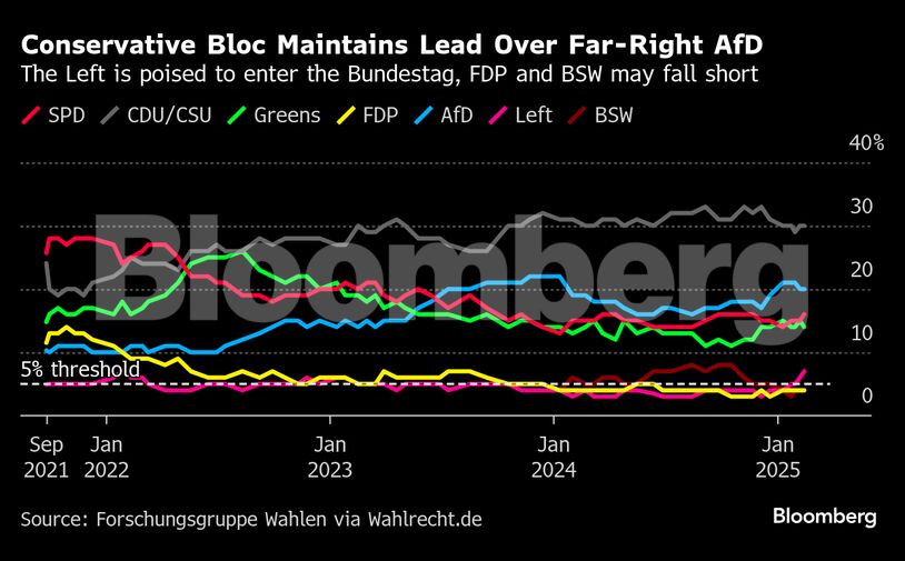 Οι επενδυτές που αναζητούν βεβαιότητα θα παρακολουθούν στενά για κάθε ένδειξη ότι η υποστήριξη προς τον συντηρητικό επικρατέστερο Φρίντριχ Μερτς και το μπλοκ του CDU/CSU είναι πιο ασθενής από ό,τι αναμενόταν.