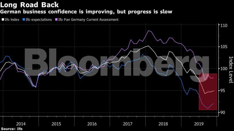 Το Ινστιτούτο Ifo δήλωσε τη Δευτέρα ότι το ο δείκτης των εκτιμήσεων των στελεχών των επιχειρήσεων ανήλθε σε υψηλό τετραμήνου, αν και η ένδειξη ήταν χαμηλότερη από τη μέση εκτίμηση των οικονομολόγων. Το ινστιτούτο εκτιμά πως η οικονομία αναπτύχθηκε με ρυθμό 0,2% αυτό το τρίμηνο, βελτιωμένο σε σχέση με το ρυθμό 0,1% του προηγούμενου τριμήνου
