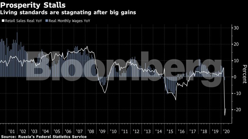 Μετά από χρόνια στασιμότητας, η οικονομία της Ρωσίας μπορεί να συρρικνωθεί κατά 6,6% φέτος και αυτή θα είναι η χειρότερη συρρίκνωση από το 2009, σύμφωνα με το Διεθνές Νομισματικό Ταμείο. Η ανάπτυξη ήταν κατά μέσο όρο κάτω από 2% την τελευταία δεκαετία, πολύ κάτω από την ετήσια ανάπτυξη άνω του 7% κατά τη διάρκεια των δύο πρώτων θητειών του Πούτιν ως προέδρου. Η ρωσική κεντρική τράπεζα βλέπει λίγα περιθώρια βελτίωσης τα επόμενα χρόνια χωρίς διαρθρωτικές μεταρρυθμίσεις.