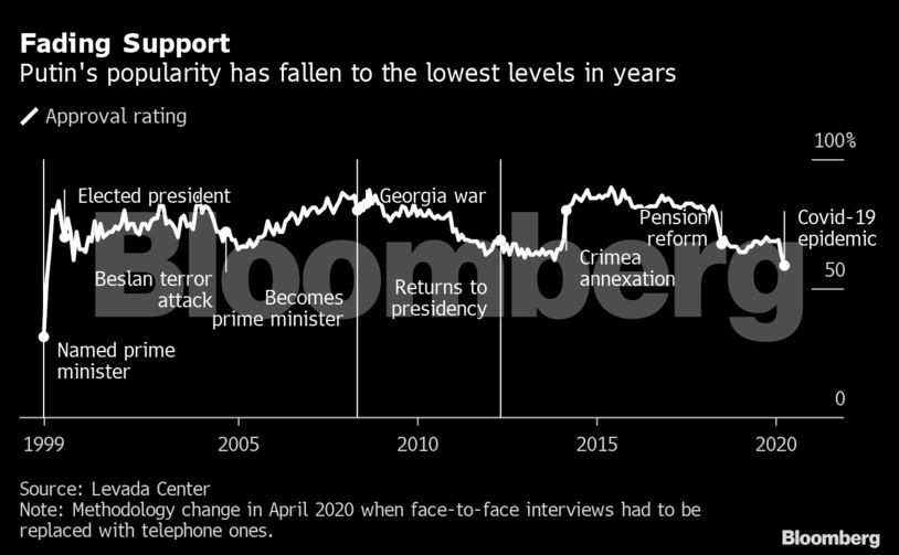 Μετά από δύο δεκαετίες στην εξουσία, τα ποσοστά του Βλαντιμίρ Πούτιν στις δημοσκοπήσεις βρίσκονται σε ιστορικό χαμηλό, καθώς η οικονομία της Ρωσίας πλήττεται από τον αντίκτυπο της πανδημίας και την πτώση των τιμών του πετρελαίου. Αντικειμενικά δεν υπάρχει καλύτερη στιγμή για να επιδιώξει ο ισχυρός άνδρας της Ρωσίας να παρατείνει την προεδρία του για δυνητικά 16 ακόμη χρόνια.