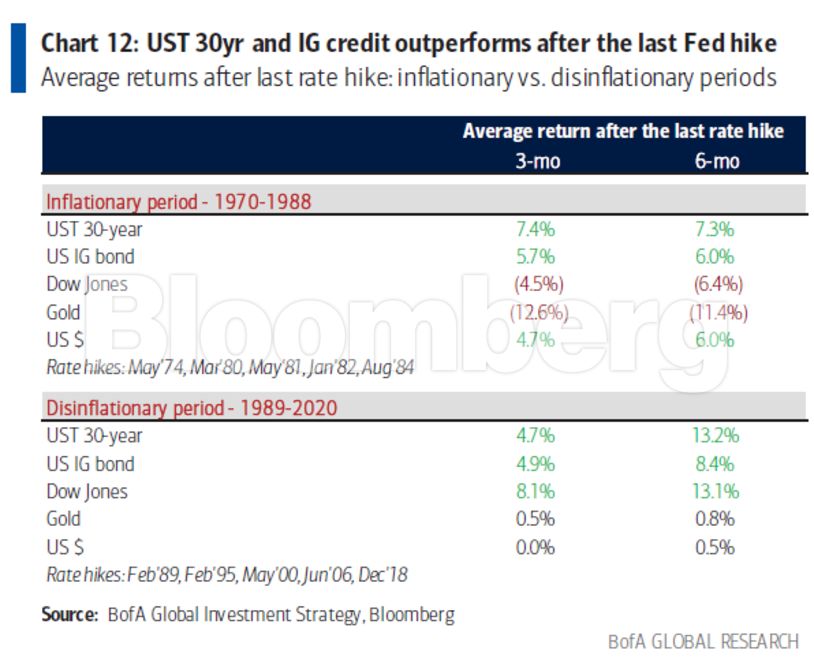 Σύμφωνα με την πρόσφατη έρευνα της ομάδας του αναλυτή Μάικλ Χάρτνετ, οι μετοχές μπορεί μεν να κατέγραψαν άνοδο μετά από την άρση των προγραμμάτων σύσφιξης της νομισματικής πολιτικής της Fed τα τελευταία 30 χρόνια, αλλά κατά τη διάρκεια του στασιμοπληθωρισμού των δεκαετιών του ‘70 και του ‘80, οι μετοχές συνέχισαν να καταγράφουν πτώση πολύ μετά από την τελευταία αύξησης των επιτοκίων.