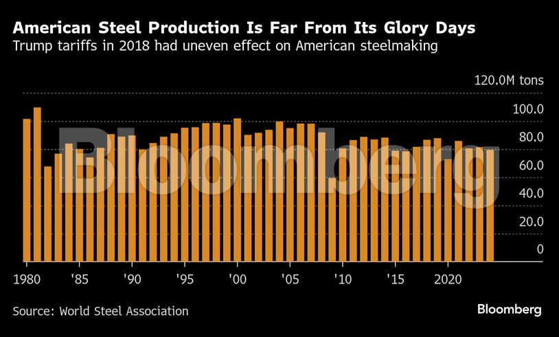 Οι μετοχές της United States Steel Corp. και της Cleveland-Cliffs Inc. σημείωσαν άλμα τη Δευτέρα 10 Φεβρουαρίου, αφού ο Τραμπ σηματοδότησε την επιστροφή στο εγχειρίδιο προστατευτισμού που χρησιμοποίησε στην πρώτη του θητεία. Εάν το παρελθόν αποτελεί κάποια ένδειξη, ο αμερικανικός τομέας χάλυβα είναι έτοιμος για έναν ακόμη γύρο επενδύσεων, αντικαθιστώντας την δυναμικότητα των παλιών υψικαμίνων με πιο αποδοτικές ηλεκτρικές. Αλλά από τότε που επιβλήθηκαν δασμοί στις εισαγωγές χάλυβα κατά την πρώτη θητεία του προέδρου, το 2018, η παραγωγή εξακολουθεί να μειώνεται.