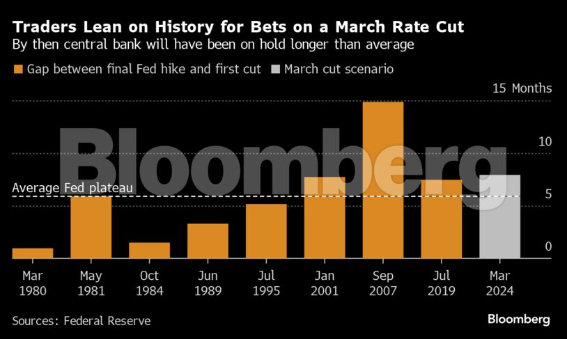 Κατά μέσο όρο, η Fed τείνει να χαλαρώνει τα επιτόκιά της περίπου ένα εξάμηνο μετά από την τελευταία αύξηση, σύμφωνα με στοιχεία του Bloomberg από το 1980 και ύστερα.