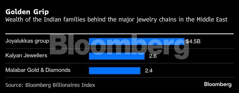 Από το Gold Souk έως τα πολυτελή εμπορικά κέντρα, ονόματα όπως Malabar Gold & Diamonds, Joyalukkas India Ltd. και Kalyan Jewellers India Ltd., όλα ιδιοκτησία των πλούσιων επιχειρηματιών της Ινδίας, κυριαρχούν στον τομέα των κοσμημάτων για τη μεσαία τάξη της περιοχής. Αυτό βοήθησε τους ιδρυτές τους να συγκεντρώσουν συνολικό πλούτο 9,5 δισεκατομμυρίων δολαρίων, σύμφωνα με τον δείκτη Bloomberg Billionaires Index.