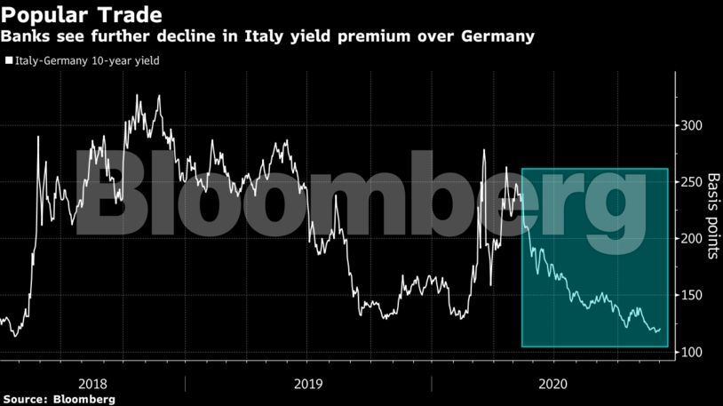 Τα ιταλικά ομόλογα έχουν επιδείξει αποδόσεις της τάξεως του 8% το 2020, τα υψηλότερα στην Ευρώπη και υπερδιπλάσια σε σύγκριση με τα αντίστοιχα γερμανικά, σύμφωνα με αναλύσεις των δεικτών της Bloomberg Barclays. Η απόδοση του ιταλικού 10ετούς υποχώρησε στο ιστορικό του 0,507% την προηγούμενη εβδομάδα, σε σχέση με το 2,99% του Μαρτίου, όταν η πανδημία «θέριζε» τη γείτονο. Το premium των επενδυτών στις τοποθετήσεις σε ιταλικό χρέος έναντι του αντίστοιχου γερμανικού έχει περιοριστεί κατά 44 μονάδες βάσης φέτος, στις 116 μονάδες βάσης.