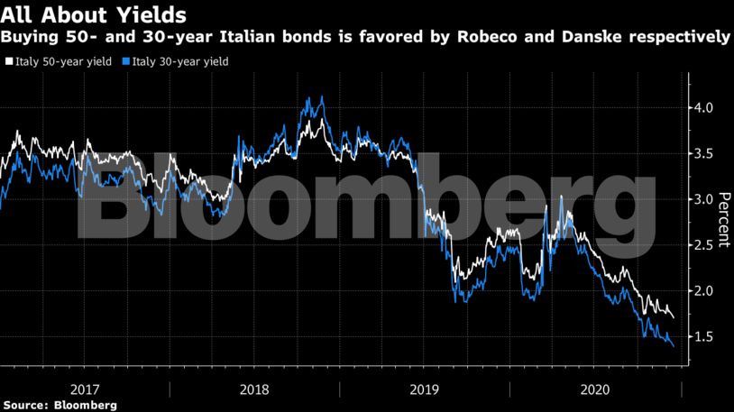 Αλλοι στρατηγικοί αναλυτές ποντάρουν σε ακόμη πιο μακροπρόθεσμα ιταλικά ομόλογα. Τα ιταλικά ομόλογα με λήξη το 2067 προσφέρουν τις καλύτερες αποδόσεις στην ευρωζώνη, σύμφωνα με τον Μάρτιν φαν Φλίετ, αναλυτή της Robeco Institutional.