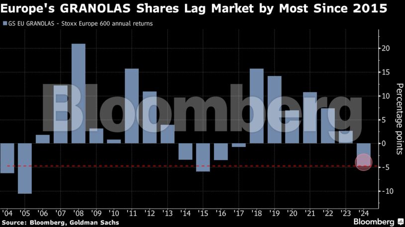 Ενώ οι 10 κορυφαίες αμερικανικές μετοχές σημείωσαν διψήφιες αποδόσεις το 2024, με κινητήρια δύναμη τις λεγόμενες Magnificent Seven, έξι από τα μεγαλύτερα ονόματα της Ευρώπης βρίσκονται στο «κόκκινο». Μεταξύ αυτών περιλαμβάνεται η κατασκευάστρια εταιρεία των Ozempic, Novo, της οποίας τα κέρδη για το έτος εξαλείφθηκαν πλήρως στο πρόσφατο selloff, καθώς και η Nestle SA και η LVMH Moet Hennessy Louis Vuitton SA.
