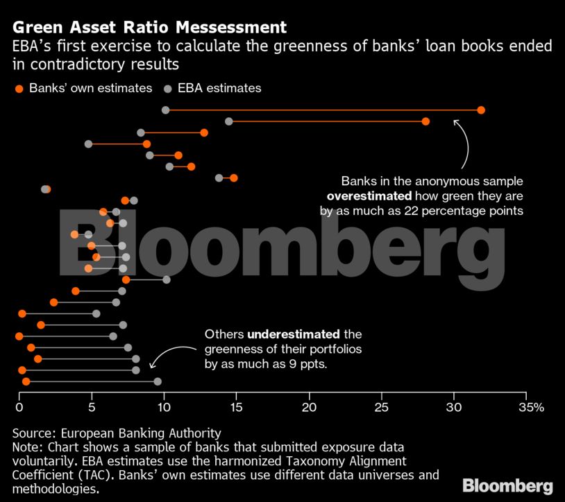 Ο δείκτης Green Asset Ratio (αναλογία των “πράσινων” περιουσιακών στοιχείων), ο οποίος υποτίθεται πως θα αναδείκνυε τη δανειακή υποστήριξη των τραπεζών προς επιχειρήσεις φιλικές προς το περιβάλλον, φαίνεται πως θα παρουσιάσει μία διεστραμμένη εικόνα της πραγματικότητας, σύμφωνα με πρόσφατο γκάλοπ 20 μεγάλων ευρωπαϊκών τραπεζών του Bloomberg. Οι επιχειρήσεις οι οποίες βασίζονται στους πελάτες τους για τον υπολογισμό του δείκτη υποστηρίζουν πως πολλές μικρομεσαίες ή πολυεθνικές εταιρείες απλά δε θα τους δώσουν τα αναγκαία δεδομένα.