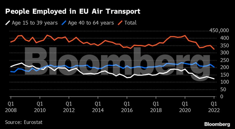 Μόλις το 1/3 των εργαζομένων στις αεροπορικές της Ευρωπαϊκής Ένωσης έχουν ηλικία υπό των 40 ετών βάσει των δεδομένων της Eurostat για το α’ τρίμηνο του έτους, ποσοστό πολύ χαμηλότερο σε σχέση με την προ-πανδημική κατάσταση.
