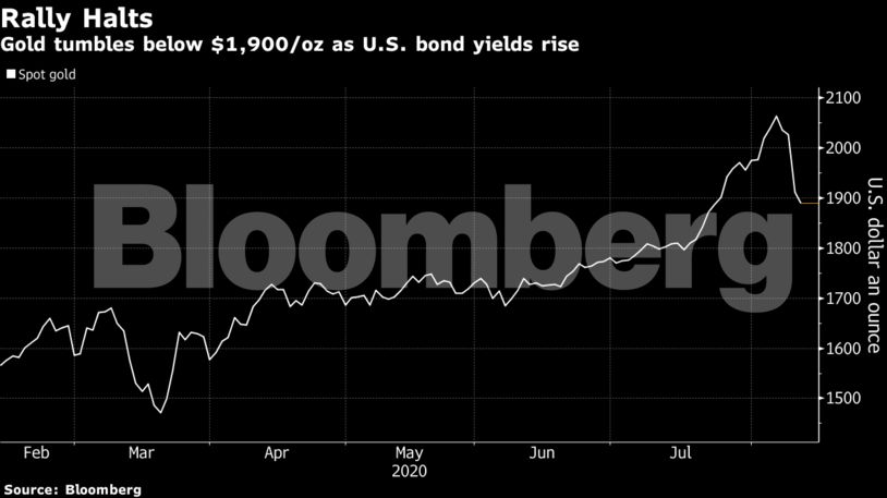 Για δεύτερη μέρα χάνει έδαφος ο χρυσός με βουτιά κάτω από τα 1900 δολάρια την ουγγιά, η μεγαλύτερη υποχώρηση εδώ και επτά χρόνια, καθώς οι επενδυτές φαίνεται να ρευστοποιούν μια από τις πιο hot τοποθετήσεις του 2020. Μετά το ιστορικό υψηλό, άνω των 2.000 δολαρίων η ουγγιά, την περασμένη εβδομάδα, το ράλι ανακόπηκε καθώς οι αποδόσεις των ομολόγων στις ΗΠΑ αυξήθηκαν ενώ ακολούθησαν εκροές από ETFs που δραστηριοποιούνται στον χρυσό.