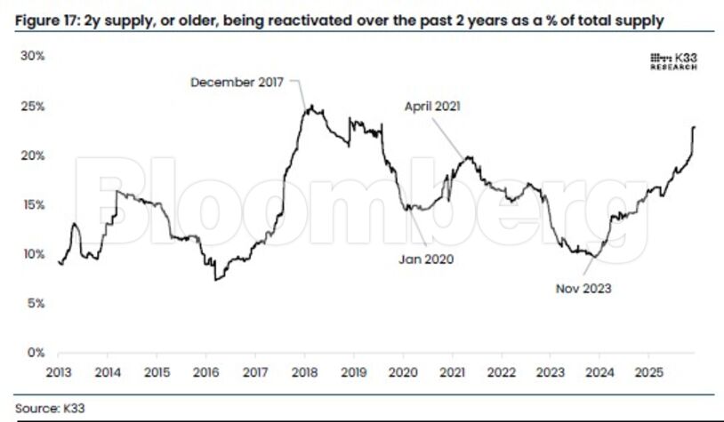 Μόνο το 2025, bitcoin αξίας σχεδόν 300 δισεκατομμυρίων δολαρίων που παρέμεναν αδρανή για πάνω από ένα χρόνο επανήλθαν στην κυκλοφορία. Η CryptoQuant, μια εταιρεία ανάλυσης blockchain, ανέφερε ότι τις τελευταίες 30 ημέρες σημειώθηκε μία από τις μεγαλύτερες ανακατανομές από μακροπρόθεσμους κατόχους εδώ και περισσότερα από πέντε χρόνια.