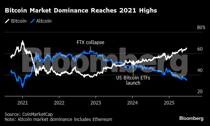 Με το bitcoin να απορροφά το μεγαλύτερο μέρος των κεφαλαιακών ροών από επενδυτές σε ΕΤFs, άλλα τμήματα της αγοράς μένουν όλο και πιο πίσω. Ακόμη και το ether, το δεύτερο μεγαλύτερο κρυπτονόμισμα, παραμένει περίπου 50% κάτω από το ιστορικό υψηλό του, μετά από μια μικρή ανάκαμψη που τροφοδοτήθηκε από εισροές σε spot ETF που επενδύουν στο token.