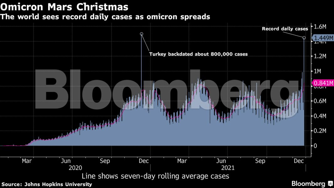 Οι πάνω από 1,44 εκατομμύρια μολύνσεις παγκοσμίως ξεπερνούν το προηγούμενο ρεκόρ, αν βγει από την εξίσωση η Τουρκία που τον Δεκέμβριο του 2020, εμφάνισε αναδρομικά σημαντικό αριθμό κρουσμάτων, μεταδίδει το αμερικανικό πρακτορείο Bloomberg. Ένας πιο συντηρητικός δείκτης -ο κυλιόμενος μέσος όρος των επτά ημερών, ο οποίος εξομαλύνει τις ημερήσιες διακυμάνσεις- βρίσκεται επίσης σε επίπεδο ρεκόρ, εξαιτίας της επέλασης της Όμικρον.