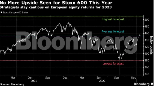 Μετά την ιστορικά καλή εκκίνηση για το 2023, ο πανευρωπαϊκός Stoxx 600 αναμένεται ότι θα κλείσει το 2023 στις 452 μονάδες, σύμφωνα με μια μέση πρόβλεψη έρευνας του Bloomberg με τη συμμετοχή 19 αναλυτών, υποδεικνύοντας μια πτώση 1,2% από το κλείσιμο της Τετάρτης. Κι αυτό, ακόμα και μετά την αναβάθμιση των προβλέψεων αρκετών επενδυτικών τραπεζών μεταξύ αυτών της Goldman Sachs και της Barclays, σε σχέση με έναν μήνα πριν.