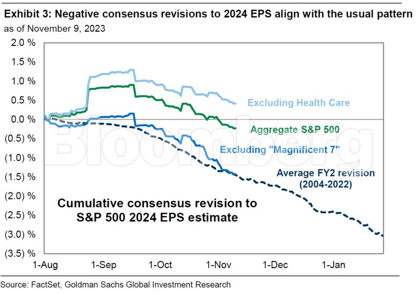 Οι εκτιμήσεις για τα κέρδη του τέταρτου τριμήνου έχουν μειωθεί κατά 4% από τις αρχές Οκτωβρίου και θέτουν χαμηλά πήχη για τις εταιρείες που εντάσσονται στον S&P 500, έγραψαν ο Ντέιβιντ Κόνστιν και οι συνεργάτες του. Οι προσδοκίες για το 2024 ακολουθούν επίσης ένα τυπικό μοτίβο και υποχώρησαν μόνο κατά 0,4%, με εξαίρεση τον κλάδο υγειονομικής περίθαλψης που αποτελεί σημαντική τροχοπέδη όπως σημειώνουν οι αναλυτές