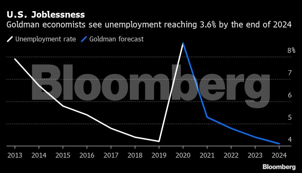 Με την τρέχουσα αναθεώρηση η Goldman Sachs εκτιμά ότι ο δείκτης ανεργίας να διαμορφωθεί στο 4,8% μέχρι το τέλος του έτους για να υποχωρήσει στο 3,6% μέχρι το τέλος του 2024. Εκτιμούν παράλληλα ότι ο ταχύτερος πληθωρισμός θα επιτρέψει στην αμερικανική Κεντρική Τράπεζα ( Fed) να αυξήσει τα επιτόκια της το δεύτερο μισό του 2024, νωρίτερα από την προηγούμενη εκτίμηση για τις αρχές του 2025.