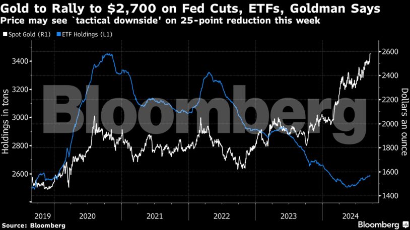 Ο χρυσός μπορεί να βρεθεί αντιμέτωπος με μια μικρή, βραχυπρόθεσμη υποχώρηση εάν η Ομοσπονδιακή Τράπεζα των ΗΠΑ επιλέξει να κάνει μόνο μια μείωση κατά 25 μονάδες βάσης αυτή την εβδομάδα. Το μέταλλο, όμως, θα σημειώσει στη συνέχεια ράλι σε επίπεδο ρεκόρ υποβοηθούμενο από τις αυξανόμενες ροές σε χρηματιστηριακά αμοιβαία κεφάλαια που υποστηρίζονται από ράβδους χρυσού, σύμφωνα με την Goldman Sachs.