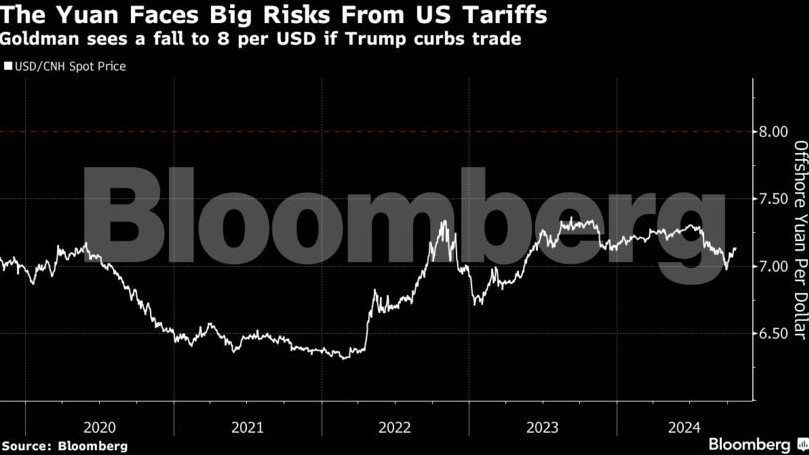 Όσον αφορά την πορεία του γουάν, αυτή θα εξαρτηθεί όχι μόνο από το εκλογικό αποτέλεσμα αλλά και το εύρος των δασμών κατά των κινεζικών προϊόντων. Μια σειρά νέων δασμών θα μπορούσαν να… στείλουν το γουάν στα 7,4 ανά δολάρια, που είναι το πλέον αδύναμο σημείο του από τότε που το Bloomberg άρχισε να καταγράφει την ισοτιμία το 2010.