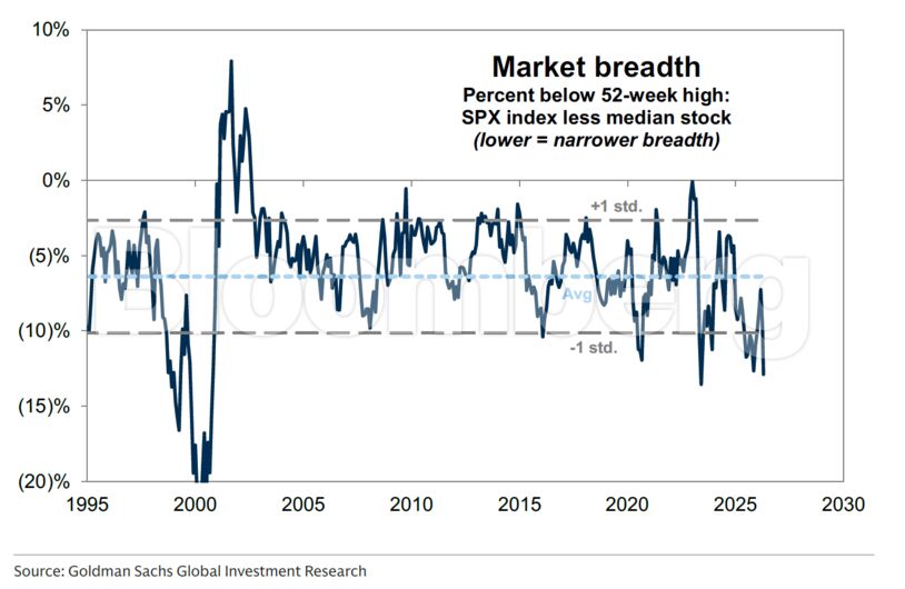Ο δείκτης άγγιξε ιστορικό υψηλό πρόσφατα, ολοκληρώνοντας την ισχυρότερη εβδομάδα του 2026. Ωστόσο, οι αναλυτές της Goldman δήλωσαν ότι τα κέρδη, όπως και οι ανοδικές αναθεωρήσεις των κερδών, δεν ήταν ευρέως κατανεμημένα. Ο δείκτης της ομάδας για το εύρος της αγοράς έχει πέσει στα χαμηλότερα επίπεδα των τελευταίων δεκαετιών, εκτός από την περίοδο της φούσκας των dot-com και τα μέσα του 2023.