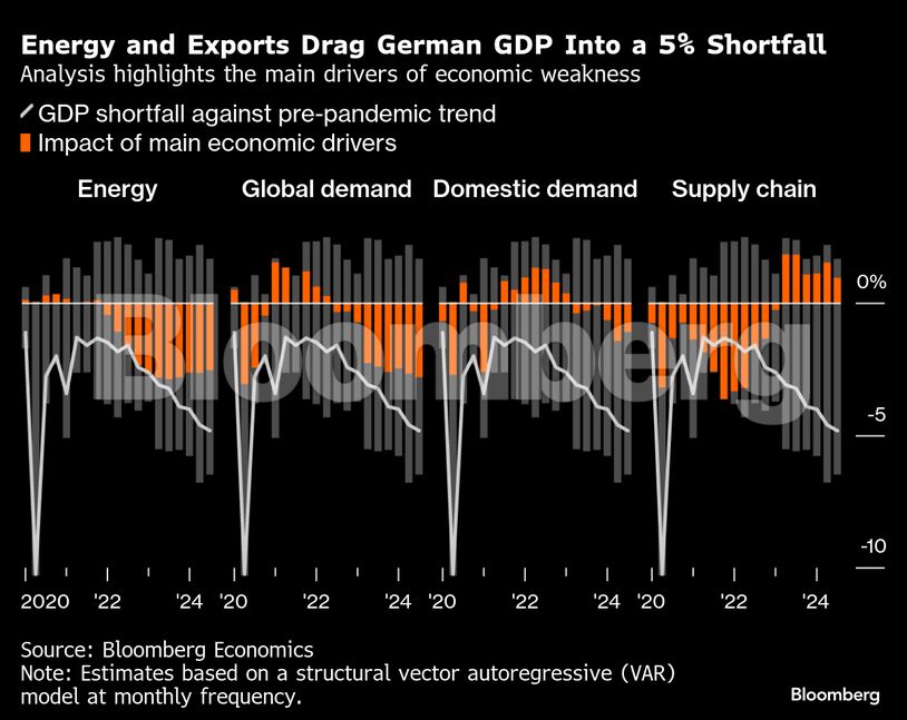 Το πιο ανησυχητικό είναι ότι, σύμφωνα με τις εκτιμήσεις του Bloomberg Economics, το μεγαλύτερο μέρος του ελλείμματος θα είναι δύσκολο να ανακτηθεί, λόγω διαρθρωτικών προβλημάτων όπως η απώλεια της φθηνής ρωσικής ενέργειας και τα προβλήματα που αντιμετωπίζουν η Volkswagen AG και η Mercedes-Benz Group AG, οι οποίες αγωνίζονται να συμβαδίσουν με τις αυτοκινητοβιομηχανίες της Κίνας.