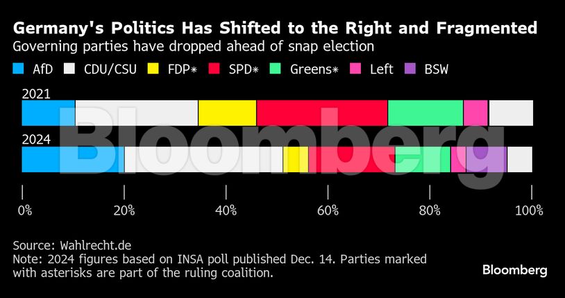 Η ακροδεξιά Εναλλακτική για τη Γερμανία, ή AfD, βρίσκεται στη δεύτερη θέση στις δημοσκοπήσεις και η αριστερή Συμμαχία Sahra Wagenknecht, ή BSW, θα μπορούσε να εισέλθει στην Μπούντεσταγκ μόλις ένα χρόνο μετά τη δημιουργία της. Συνδυαστικά, έχουν την υποστήριξη περίπου του 25% του εκλογικού σώματος.
