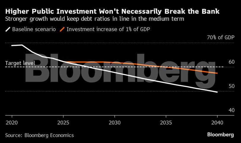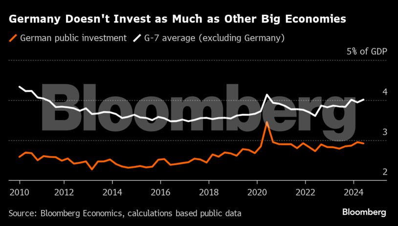 Για να αναζωογονήσει την ανταγωνιστικότητα, η Γερμανία πρέπει τελικά να δαπανήσει περισσότερα. Μόνο και μόνο για να φτάσει τις άλλες προηγμένες οικονομίες, η χώρα θα πρέπει να αυξήσει τις ετήσιες επενδύσεις σε υποδομές και άλλα δημόσια αγαθά κατά περίπου το ένα τρίτο σε 160 δισ. ευρώ, σύμφωνα με το Bloomberg Economics. Αυτή η αύξηση ισοδυναμεί με περισσότερο από 1% του ΑΕΠ.