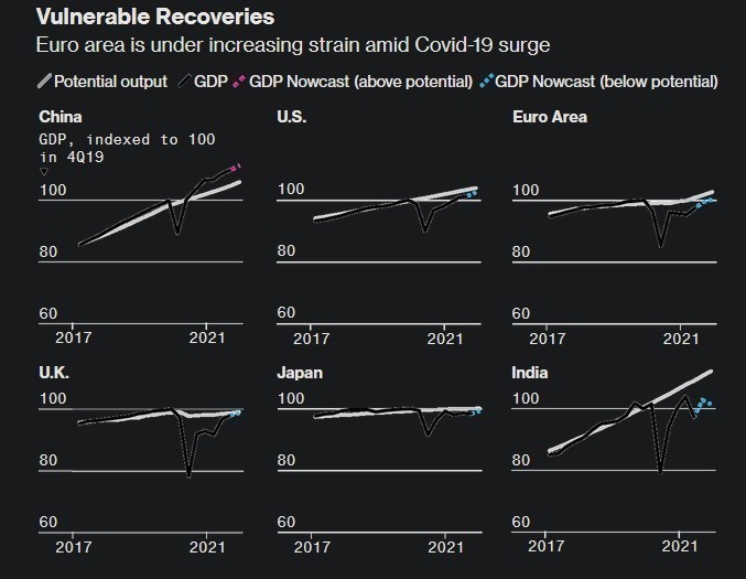 Σύμφωνα, τέλος, με την ανάλυση, η ανάπτυξη των οικονομιών των ΗΠΑ και της Ευρωζώνης έχει συρρικνωθεί λόγω της πανδημίας. Αντιθέτως, η ανάπτυξη της Κίνας έχει επιστρέψει σε επίπεδα προ-πανδημίας.