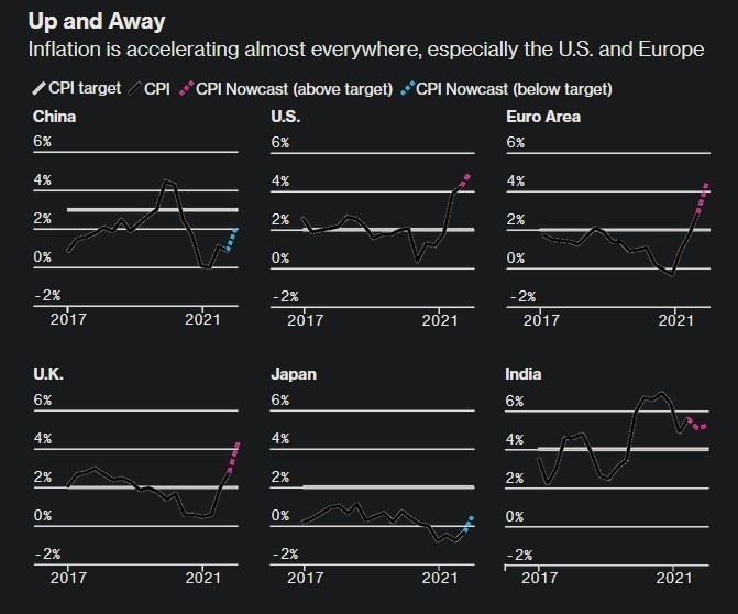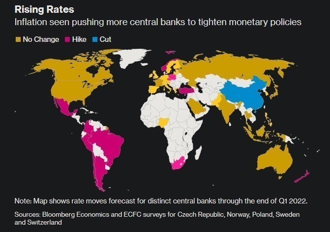 Το Bloomberg Economics υπολογίζει πως οι κεντρικές τράπεζες της Βραζιλίας, του Μεξικό, της Νορβηγίας, της Νέας Ζηλανδίας και της Νότιας Αφρικής θα είναι αυτές που θα αυξήσουν τα επιτόκιά τους το πρώτο τρίμηνο του 2022.