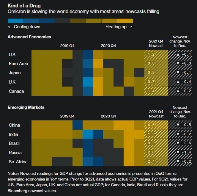 Σύμφωνα με τις νέες αναλύσεις του πρακτορείου Bloomberg, η παγκόσμια οικονομία καταγράφει ανάπτυξη μόλις 0,7% το τελευταίο τρίμηνο του 2021, στο ήμισυ του τρίτου τριμήνου και υπό το 1% της προ-πανδημίας εποχής.