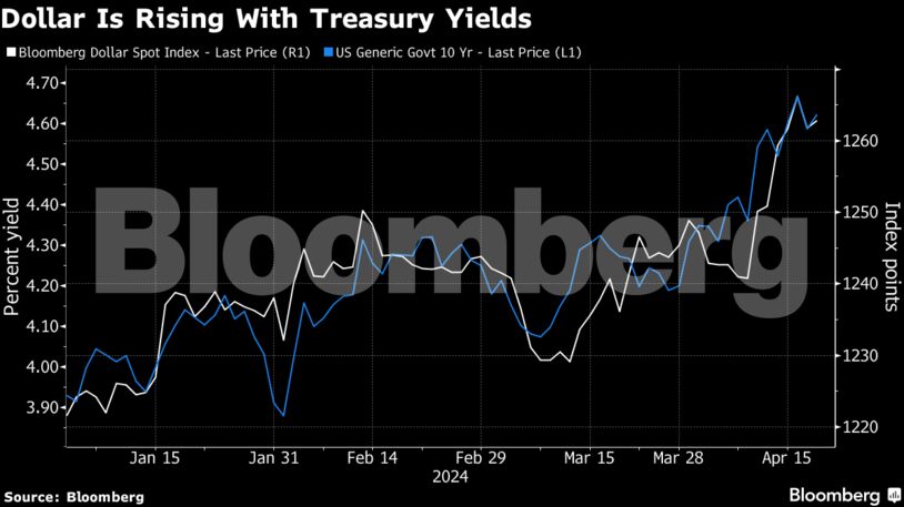 Καθώς οι αγορές μειώνουν τα στοιχήματα για χαλάρωση της Fed, οι αποδόσεις των κρατικών ομολόγων έχουν εκτοξευθεί και πάλι τις τελευταίες εβδομάδες, στέλνοντας τις αποδόσεις των τίτλων αναφοράς κοντά στο 5%. Η άνοδος αυτή αποτέλεσε σημαντικό παράγοντα της ελκυστικότητας του δολαρίου, το οποίο επωφελήθηκε επίσης από τις αδιάκοπες εισροές σε αμερικανικές μετοχές εν μέσω της φρενίτιδας για την τεχνητή νοημοσύνη.