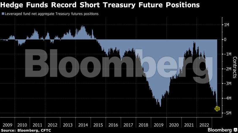 Σε νέο υψηλό αύξησαν τα μοχλευμένα funds τις short τοποθετήσεις τους σε futures αμερικανικών ομολόγων, σύμφωνα με ανάλογο δείκτη δεδομένων της Commodity Futures Trading Commission. Πρόκειται για την έβδομη συνεχόμενη εβδομάδα των shorts τέτοιου είδους, σε ρεκόρ από το 2017.