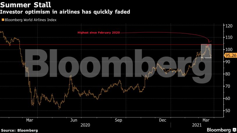 Ήδη στα χρηματιστήρια η αισιοδοξία που στήριζε τον δείκτη Bloomberg World Airlines Index έχει πια εξαφανιστεί.