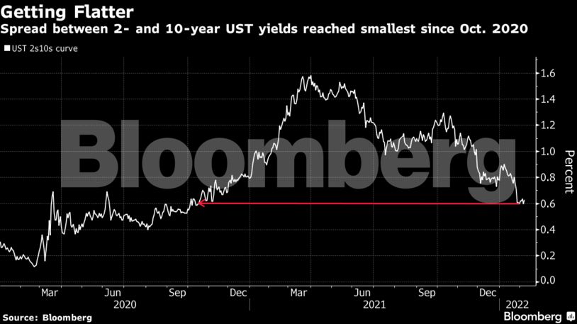 Τον Ιανουάριο, το spread μεταξύ του 2ετούς και 10ετούς αμερικανικού κρατικού ομολόγου βρέθηκε στο χαμηλότερο επίπεδο από τον Οκτώβριο του 2020. Αν και μέρος της μείωσης αυτής οφείλεται στην αύξηση των επιτοκίων, η ομαλοποίηση της απόδοσης ενδέχεται να αποτελεί προειδοποίηση πως η οικονομική ανάπτυξη των ΗΠΑ δε θα είναι τόσο εύρωστη όσο ανέμεναν οι αναλυτές.