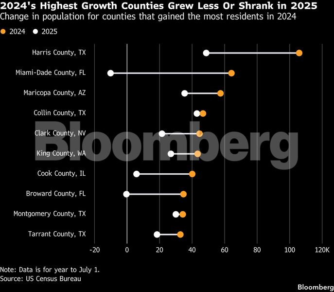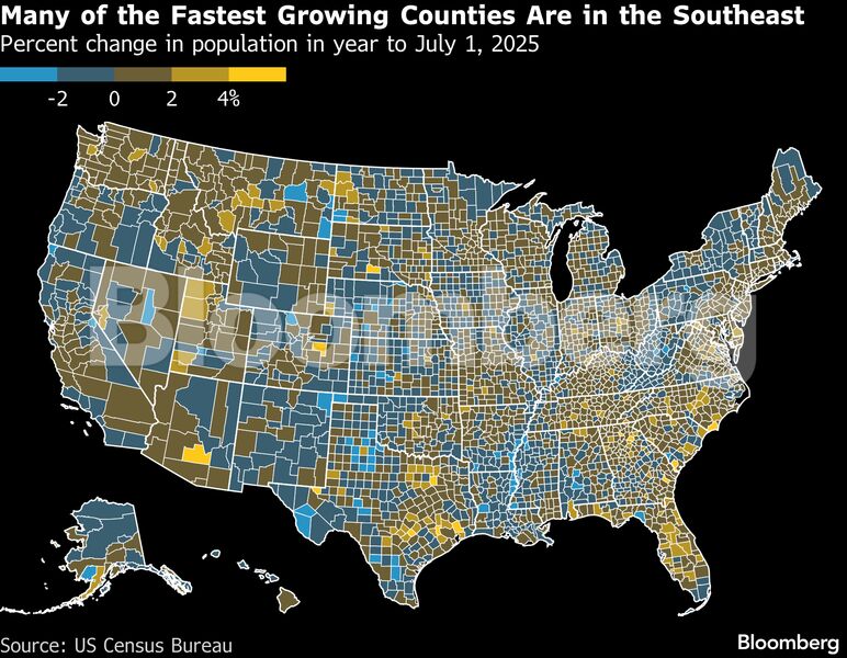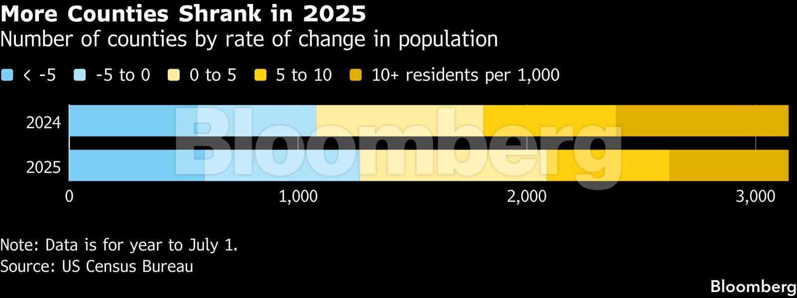 Τέσσερις στις δέκα κομητείες των Ηνωμένων Πολιτειών κατέγραψαν πληθυσμιακή συρρίκνωση το προηγούμενο έτος, καθώς η αυστηροποίηση της μεταναστευτικής πολιτικής του Προέδρου των Ηνωμένων Πολιτειών Ντόναλντ Τραμπ εξακολουθεί να περιορίζει την κύρια κινητήρια δύναμη αύξησης του πληθυσμού.