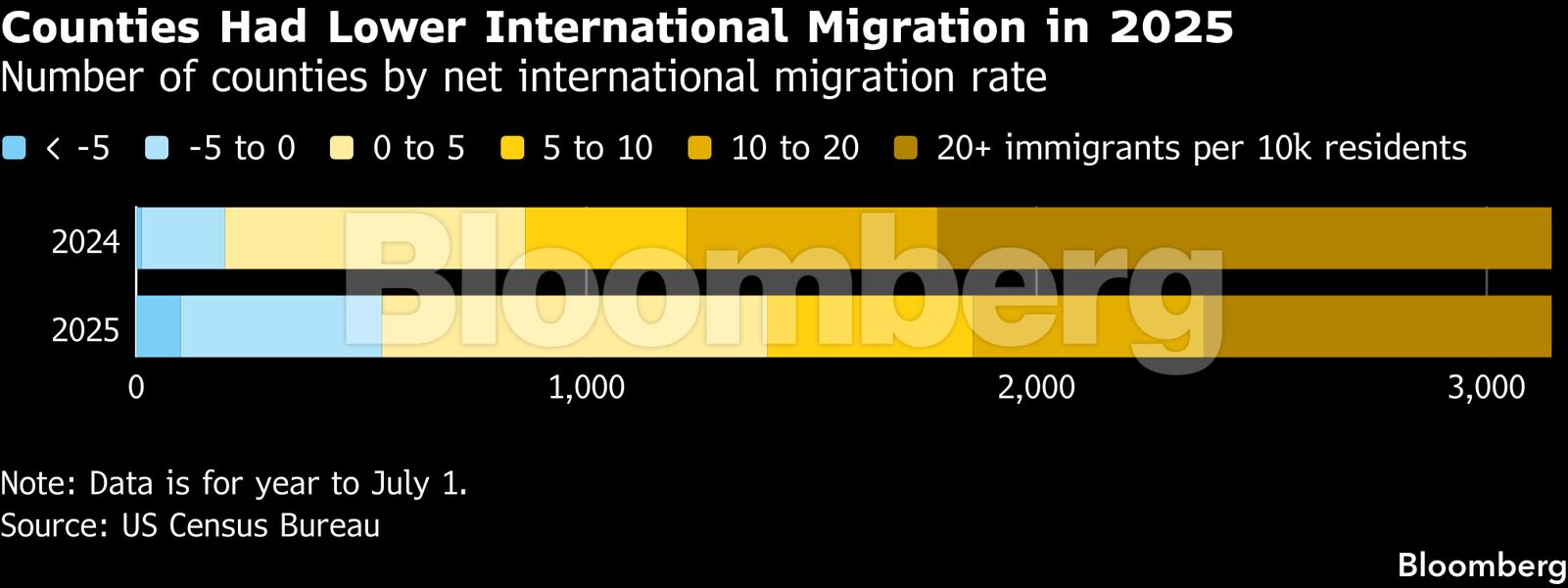 Ο δημογράφος της Υπηρεσίας Απογραφής Τζορτζ Χέιγουορντ υπογράμμισε ότι πέντε πολιτείες συγκέντρωσαν σχεδόν το ήμισυ της καθαρής διεθνούς μετανάστευσης για το έτος έως τον Ιούλιο του 2025, ενώ μόλις 10 κομητείες αντιστοιχούσαν σχεδόν στο ένα τέταρτο της συνολικής πληθυσμιακής αύξησης. Οι ίδιες αυτές περιοχές είναι και εκείνες που πλήττονται εντονότερα από τη μείωση των ροών.
