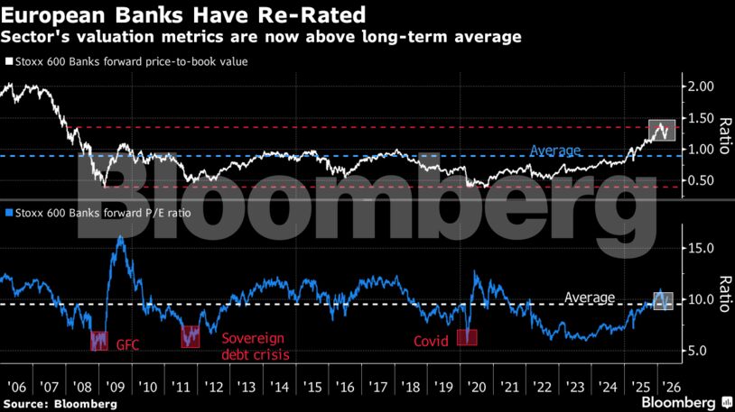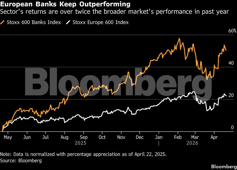 Οι μετοχές των ευρωπαϊκών τραπεζών υπεραπέδωσαν σε σχέση με την ευρύτερη αγορά το προηγούμενο έτος, αν και η άνοδος του δείκτη Stoxx 600 Banks κατά λιγότερο από 4% το 2026 υστέρησε σε σχέση με την άνοδο του κύριου δείκτη.