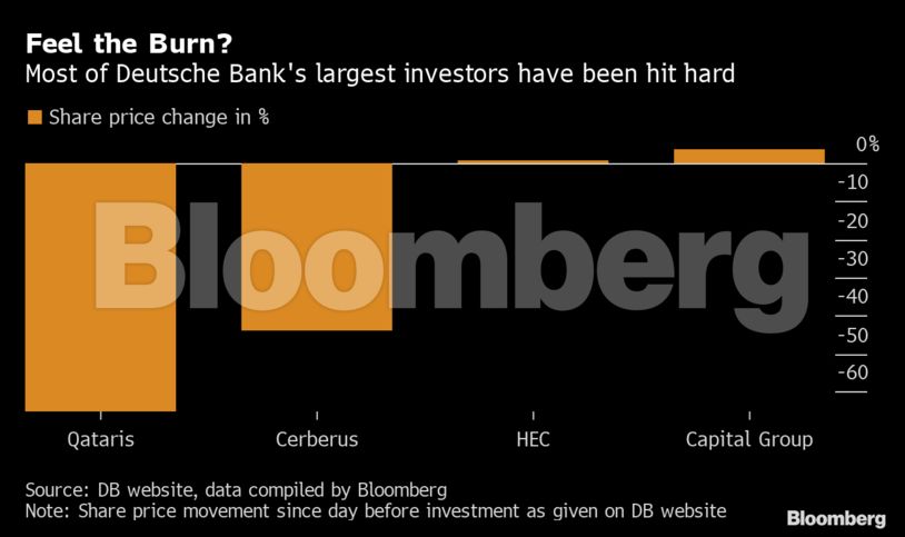 Ωστόσο, οι κορυφαίοι επενδυτές έχουν υποστεί σημαντικές απώλειες από την Deutsche Bank. Η μετοχή της μειώθηκε περισσότερο από 40% από τότε που η Cerberus Capital Management ανακοίνωσε τη συμμετοχή της τον Νοέμβριο του 2017. Άλλοι κύριοι μέτοχοι όπως η BlackRock Inc. και τα μέλη της βασιλικής οικογένειας του Κατάρ κατέγραψαν επίσης απώλειες όταν η γερμανική τράπεζα ζήτησε νέα κεφάλαια.
