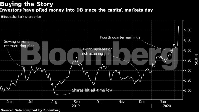 Οι μετοχές της Deutsche Bank έχουν καταγράψει κέρδη άνω του 40% από τότε που ο Sewing παρουσίασε τον Δεκέμβριο στους επενδυτές την πρόοδο που σημειώθηκε στην αναθεώρηση των στόχων της τράπεζας. Πλέον είναι η τραπεζική μετοχή με τις καλύτερες αποδόσεις μεταξύ των ευρωπαϊκών τραπεζών. Τα ασφάλιστρα κινδύνου (CDS) της τράπεζας διαπραγματεύονται κοντά σε ένα χαμηλό 2 ετών, ενισχύοντας με ένα ακόμα σημάδι την αίσθηση υποχώρησης της κρίσης.