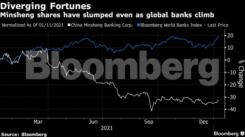 Οι ζημιές από δάνεια σε εταιρείες, μια εκ των οποίων ήταν και η πολύπαθη Evergrande, άρχισαν να συσσωρεύονται για την China Minsheng Banking. H μετοχή της βυθίστηκε με απώλειες 31% το δωδεκάμηνο έως και την περασμένη εβδομάδα. Αυτή ήταν και η χειρότερη επίδοση μεταξύ των 155 τραπεζών στον δείκτη του Bloomberg World Banks.