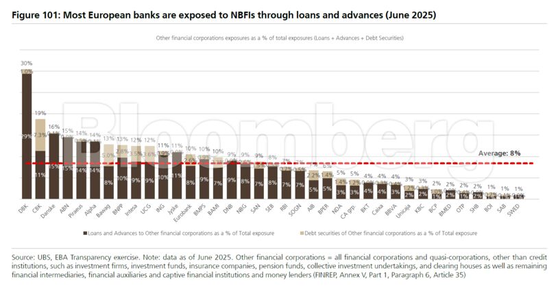 Παράλληλα, η UBS διευκρινίζει ότι η ανάλυση βασίζεται σε έναν ευρύ ορισμό των μη τραπεζικών χρηματοπιστωτικών ιδρυμάτων (NBFIs). Πολλές από τις εκθέσεις αυτές θεωρούνται πλήρως εξασφαλισμένες και χαμηλού κινδύνου, γεγονός που σημαίνει ότι δεν είναι ορθό να αντιμετωπίζονται όλες οι σχετικές τοποθετήσεις ως ομοιογενείς ή εξίσου επισφαλείς.