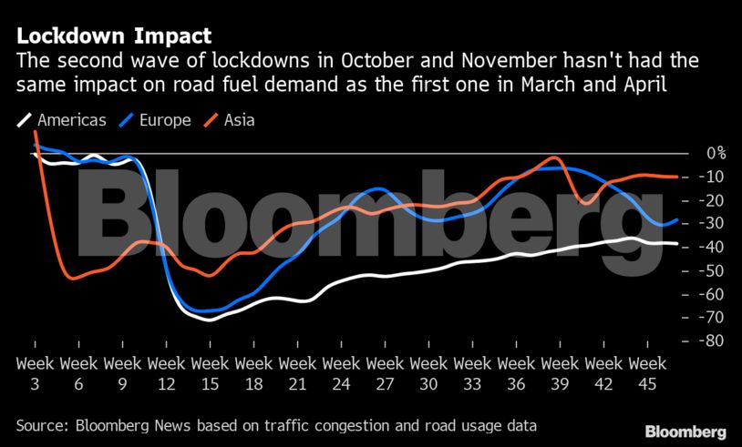 Tα δεδομένα δείχνουν μείωση στις αρχές Νοεμβρίου της τάξεως του 30% σε σχέση με τα δεδομένα προ-COVID, σε σχέση με περίπου 70% μείωση μεταξύ Μαρτίου και Απριλίου, σύμφωνα με το παραπάνω γράφημα του Bloomberg News. Τα πιο πρόσφατα δεδομένα, μάλιστα, υποδεικνύουν πως η πτώση στη ζήτηση βενζίνης κίνησης έπεσε σε χαμηλό στις 15 Νοεμβρίου, και ανακάμπτει από τότε. Με μερικές Ευρωπαϊκές χώρες να χαλαρώνουν τα μέτρα λόγω Χριστουγέννων, η ζήτηση αναμένεται να αυξηθεί περαιτέρω.