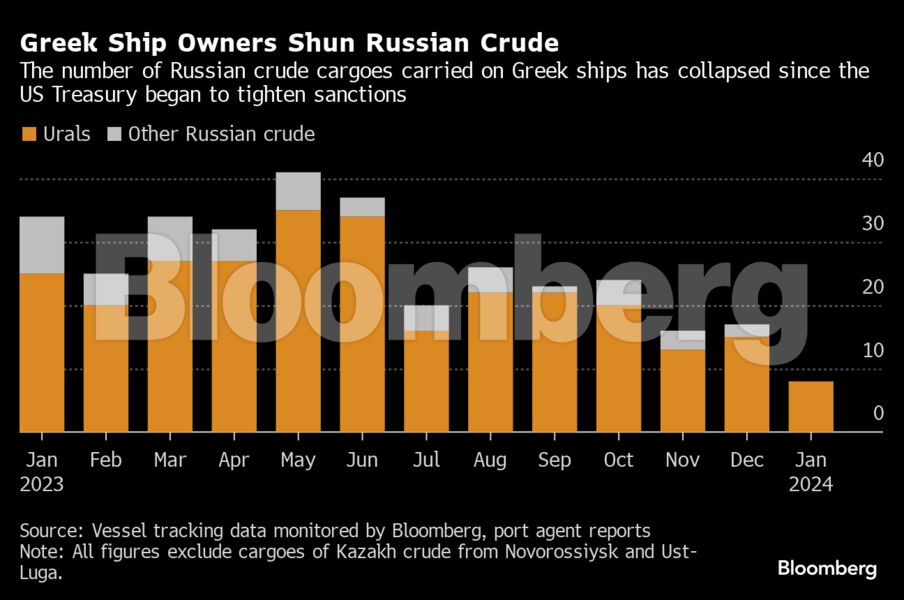 Ο αριθμός των δεξαμενόπλοιων ελληνικών συμφερόντων που μεταφέρουν ρωσικό αργό μειώθηκε σε μόλις οκτώ τον Ιανουάριο, σύμφωνα με τα στοιχεία παρακολούθησης πλοίων που συγκέντρωσε το Bloomberg. Υπενθυμίζεται ότι τον Μάιο ο αριθμός των πλοίων ξεπερνούσε τα 40, ενώ κατά το μεγαλύτερο μέρος του δεύτερου εξαμήνου του 2023, περίπου 20 πλοία ελληνικών συμφερόντων που μετέφεραν ρωσικό αργό.