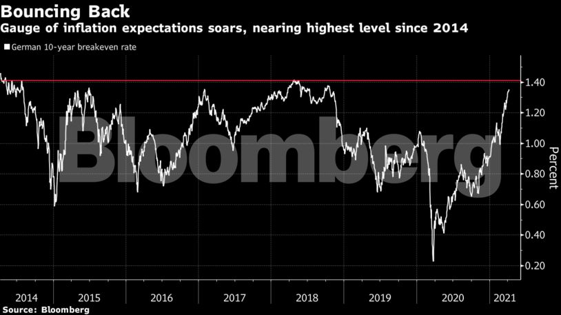 Η Γαλλία, για παράδειγμα, κατάφερε να εμβολιάσει 10 εκατομμύρια πολίτες μια εβδομάδα νωρίτερα από όσο προγραμμάτιζε, ενώ η Γερμανία έχει υπερδιπλασιάσει την ταχύτητα εμβολιασμού της. Η γερμανική οικονομία η οποία βασίζεται στις εξαγωγές απολαμβάνει μια αύξηση των εσόδων λόγω της γενικότερης οικονομικής ανάκαμψης, αυξάνοντας τις προσδοκίες. Το αναμενόμενο πληθωριστικό ποσοστό των 10ετών ομολόγων δημοσίου της (breakeven rate) βρίσκεται στο 1,35%, το υψηλότερο από το 2014.