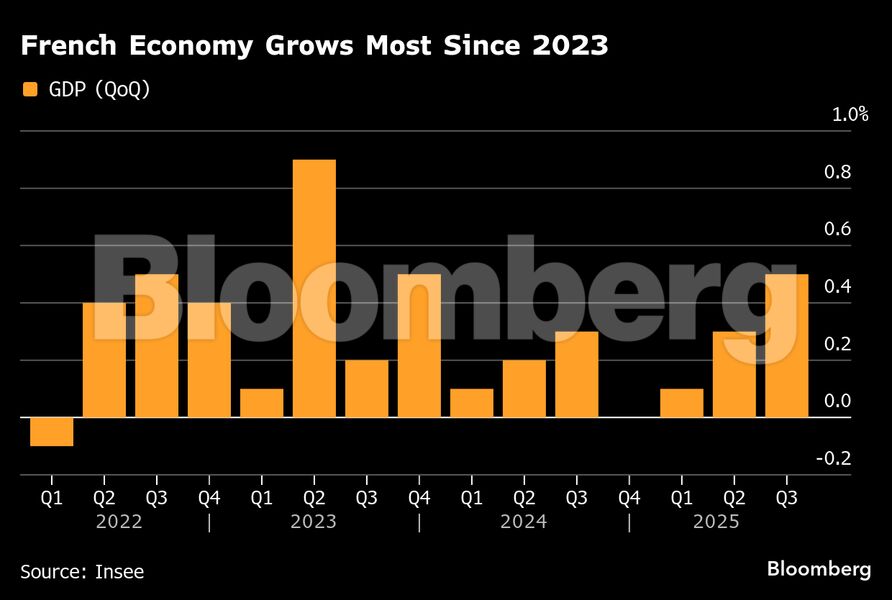 Η γαλλική οικονομία παρουσίασε απροσδόκητα ισχυρή ανάπτυξη, αψηφώντας την πολιτική αναταραχή που ταλανίζει τη χώρα. Το ΑΕΠ της δεύτερης μεγαλύτερης οικονομίας της Ευρωζώνης αυξήθηκε κατά 0,5% το τρίτο τρίμηνο — από 0,3% το προηγούμενο — υπερδιπλάσιο των προβλέψεων των αναλυτών.