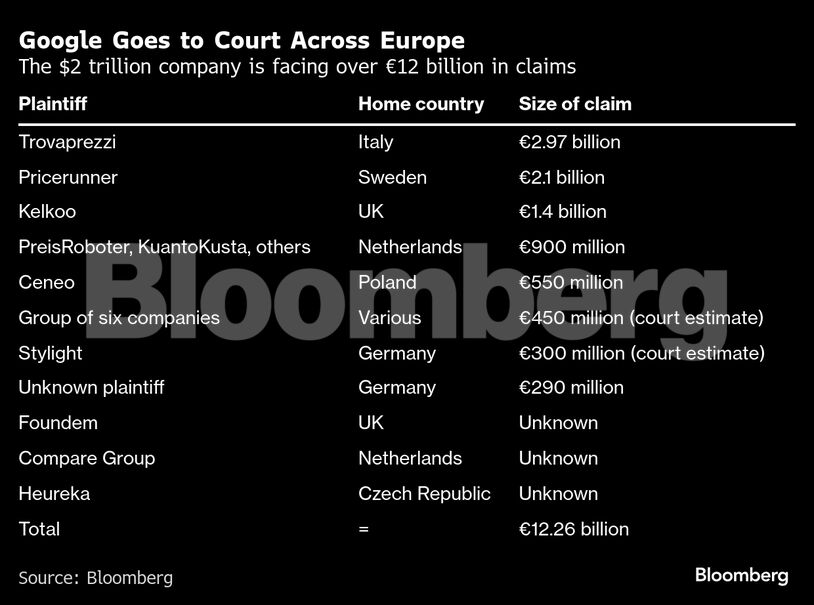 Η Google της Alphabet αντιμετωπίζει τουλάχιστον 12 δισεκατομμύρια ευρώ σε αξιώσεις αποζημίωσης από δεκάδες ιστοσελίδες σύγκρισης τιμών σε ολόκληρη την Ευρωπαϊκή Ένωση, οι οποίες ισχυρίζονται ότι ο γίγαντας αναζήτησης και διαφήμισης έκλεψε τους πελάτες τους, σύμφωνα με μια επισκόπηση του Bloomberg News.