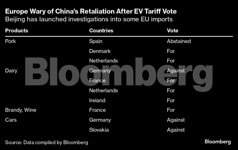 Το Πεκίνο έχει απειλήσει προηγουμένως με δασμούς στις εισαγωγές μπράντι της Ε.Ε. και έχει ξεκινήσει έρευνες ενάντια στο ευρωπαϊκό χοιρινό κρέας και τα ευρωπαϊκά γαλακτοκομικά προϊόντα ως απάντηση στους δασμούς – προσφέροντας μια σειρά από επιλογές που επηρεάζουν διαφορετικά μέρη της Ευρώπης, σύμφωνα με το Bloomberg.